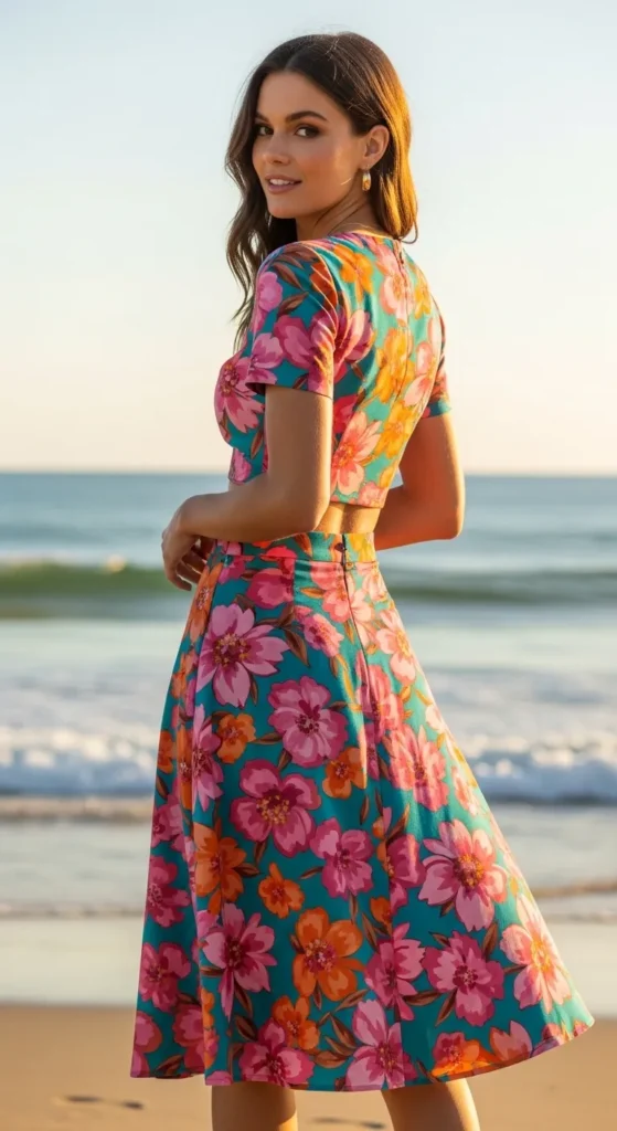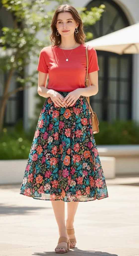 A floral midi skirt paired with a fitted tee creates a casual yet festive look. The skirt brings vibrancy and charm, while the fitted tee keeps the outfit balanced and modern.