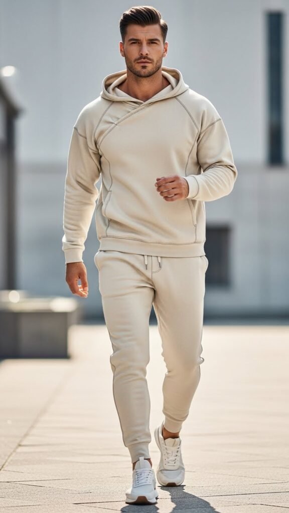 The cream essentials athleisure set is perfect for men who want comfort without sacrificing style. Pairing a soft hoodie with matching joggers creates a cohesive, modern look, solving the common problem of casual outfits looking sloppy or disconnected.