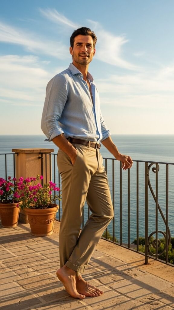 Capture the effortless charm of summer with the light blue linen shirt paired with khaki trousers, perfect for a Mediterranean-inspired look. This combination solves the common style challenge of staying cool while looking polished; linen provides breathability, while khaki adds a timeless, versatile base.