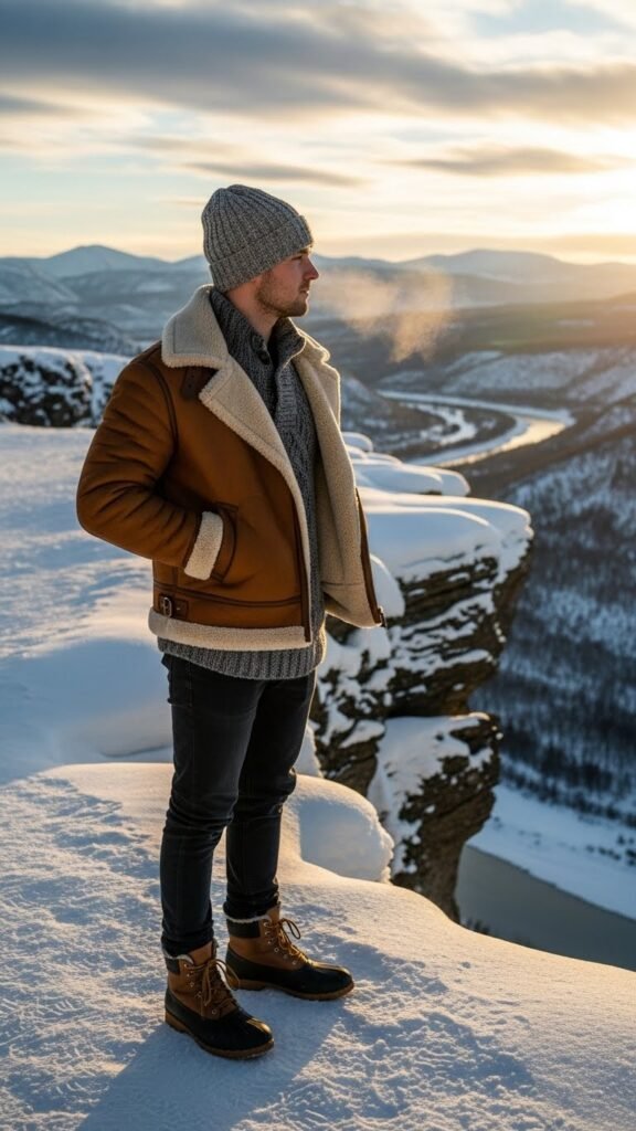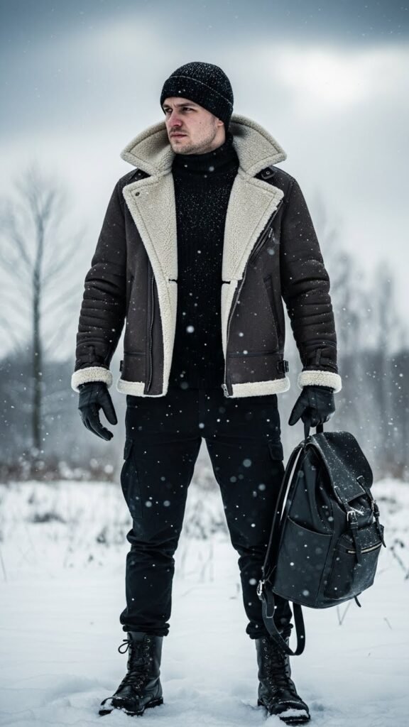 Step into winter with confidence in a shearling jacket layered over an all-black outfit, a look that balances warmth and edgy sophistication. This combination solves the age-old winter problem of looking bulky or dull—layering with shearling keeps you cozy while the monochrome base maintains a streamlined, bold silhouette.