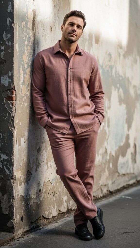 Stand out with a dusty rose coordinated set, offering a fresh twist on casual menswear. Using tonal matching ensures a balanced, intentional look, solving the challenge of making bold colors feel sophisticated rather than overwhelming.