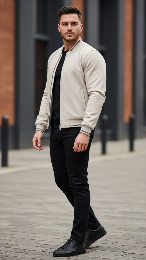 The cream bomber jacket paired with dark basics is the ultimate solution for men who want a sleek, modern look without overcomplicating their outfit. The contrast between the light jacket and darker layers underneath instantly elevates casual styling, solving the common problem of outfits feeling flat or monotonous.