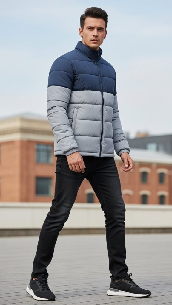 The two-tone puffer jacket adds dimension and keeps your winter styling practical yet stylish. It solves the problem of bland winter outfits by introducing visual interest.