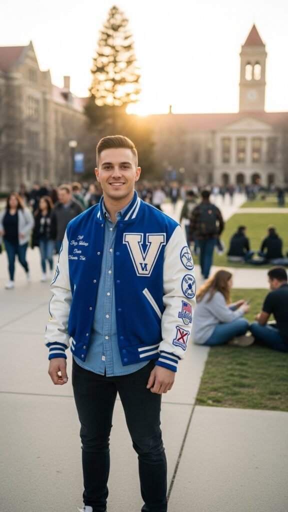 Channel a youthful, sporty energy with the blue letterman jacket layered over casual staples. This outfit solves the problem of blending casual and structured pieces—creating a stylish yet relaxed vibe that works for school, college, or casual urban outings.
