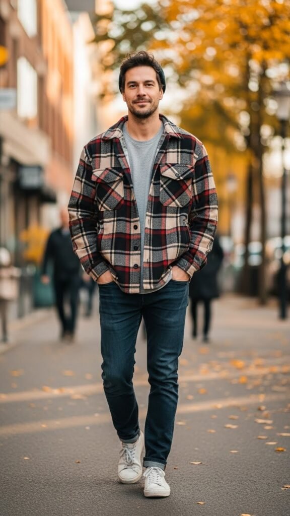 A plaid overshirt is the perfect way to layer up without adding bulk. Worn over a basic tee and paired with slim jeans, it creates a balanced, practical look that works just as well for busy workdays as it does for relaxed weekends. This combination tackles the everyday layering dilemma by keeping you warm while still looking sharp and put together.