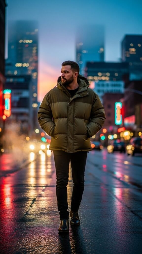 The olive puffer jacket is a functional and stylish solution for colder months, perfect for men who want warmth without compromising on urban style. Its bold silhouette solves the problem of everyday winter wear looking bulky or dull.