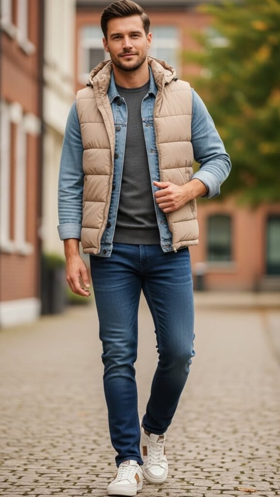 The beige puffer vest layered over neutral basics is a practical yet stylish solution for transitional weather. It solves the layering challenge—keeping you warm without adding bulk while maintaining a streamlined silhouette.
