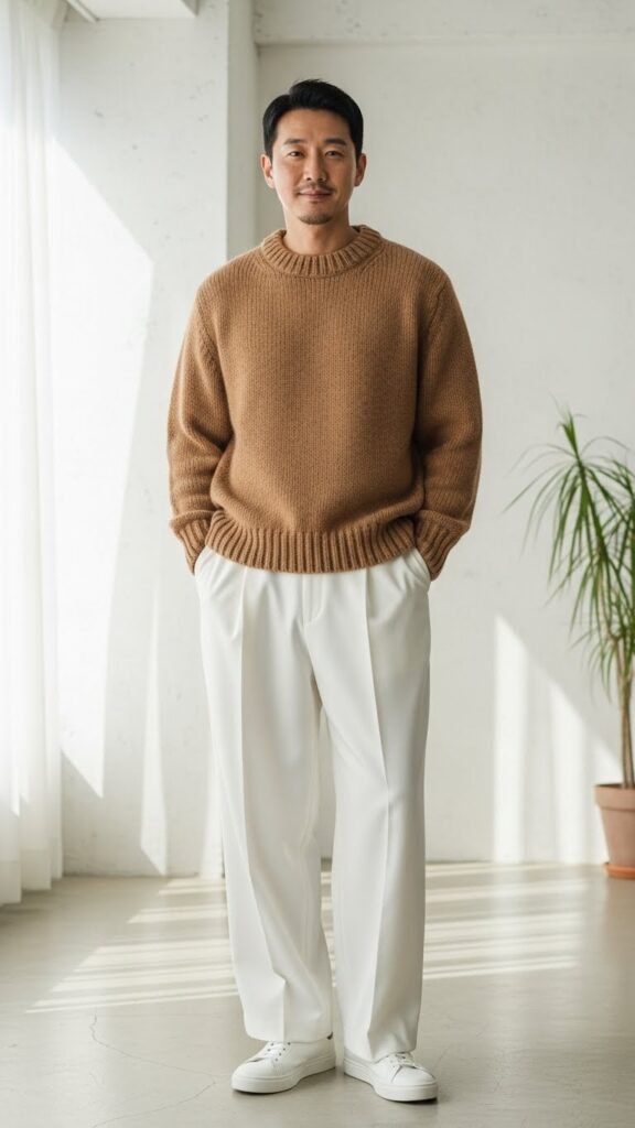 8. Luxe Minimalist: Camel Knit + White Trousers