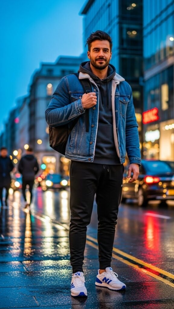 For men who crave comfort without losing style, the denim sherpa jacket layered over athleisure basics is a perfect match. This solves the problem of casual outfits appearing sloppy—the structured denim with textured sherpa adds dimension and a street-ready vibe.