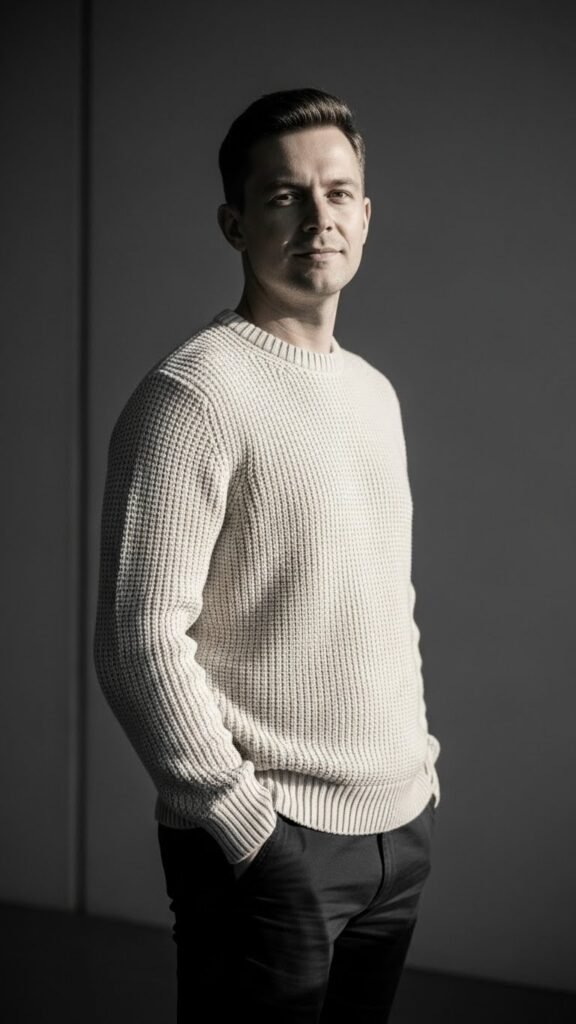 The cream knit ensemble delivers effortless sophistication with a minimalist approach. It solves the common problem of casual outfits looking messy. Monochrome tones keep the look clean and cohesive.