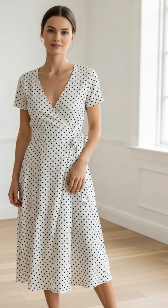 Polka dot wrap dresses bring an effortless charm that feels both playful and practical. The wrap design helps solve fit concerns by adjusting naturally to the body, making it a reliable choice for plus-size spring wear. This look feels easy without appearing too casual.