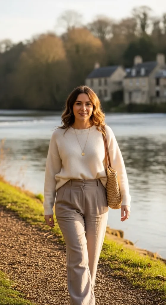 Riverside walks are peaceful, and outfits should reflect that calm energy. Soft neutral tones create a clean, effortless look while keeping the focus on comfort. This approach helps avoid bold choices that can feel overwhelming.