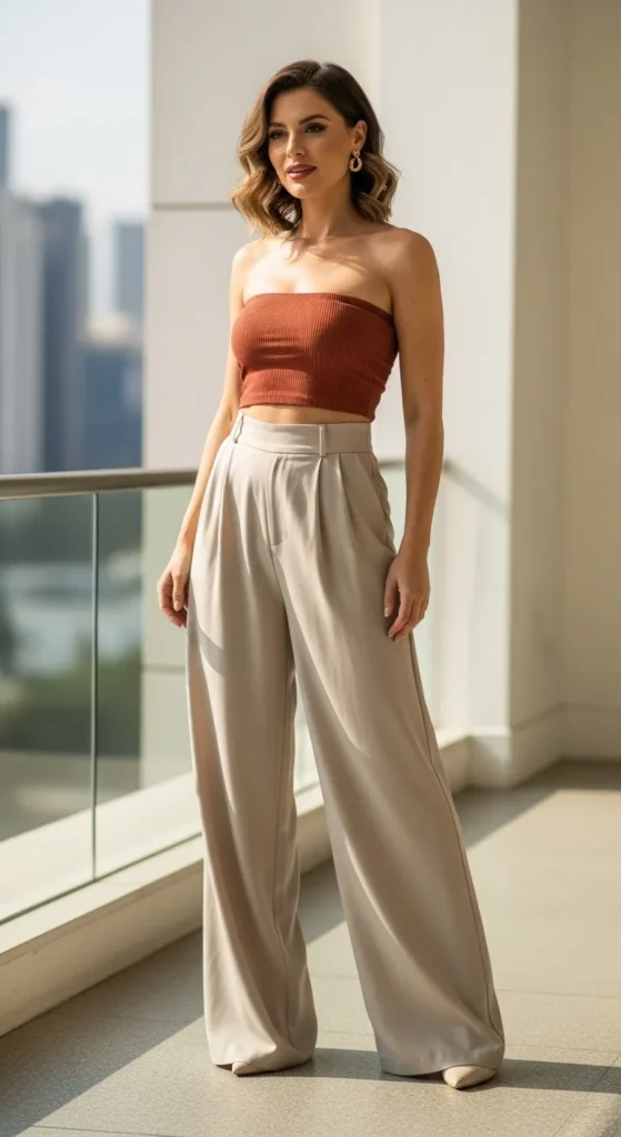 Some avoid tube tops due to comfort concerns, but high-waisted wide-leg pants provide support and coverage. This combination solves the problem of looking too revealing while still giving you a trendy, airy summer outfit that feels confident and modern.