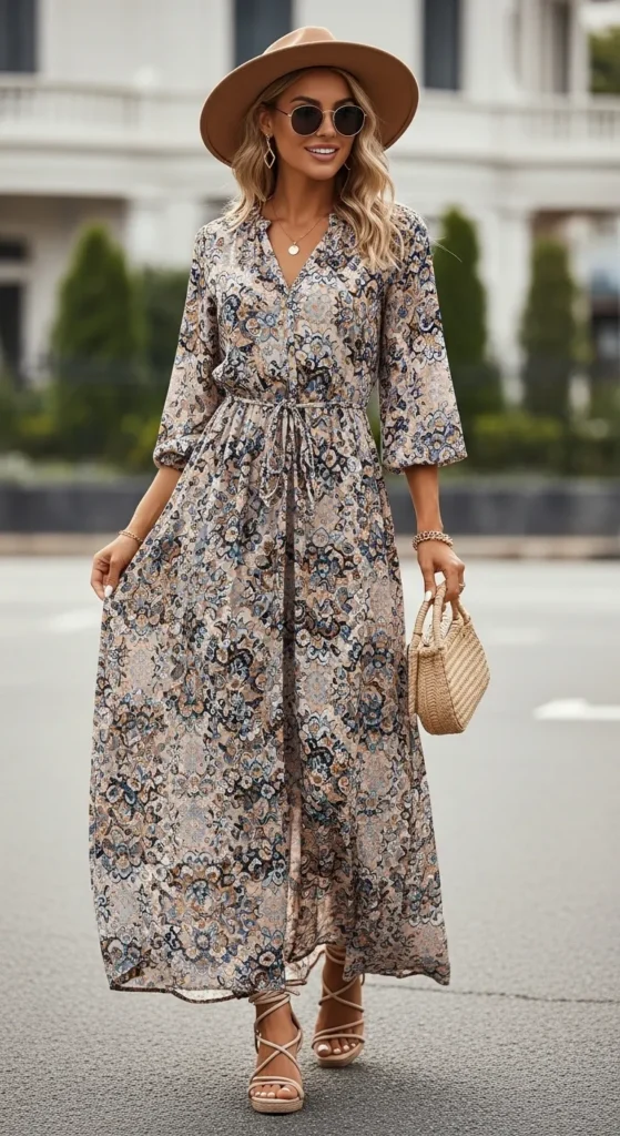 Picture a warm afternoon when you want something light, feminine, and easy to move in. A flowy maxi dress paired with strappy sandals gives you instant comfort while still looking stylish enough for brunch or a casual gathering. You don’t have to worry about complicated styling; it’s a one-step outfit.