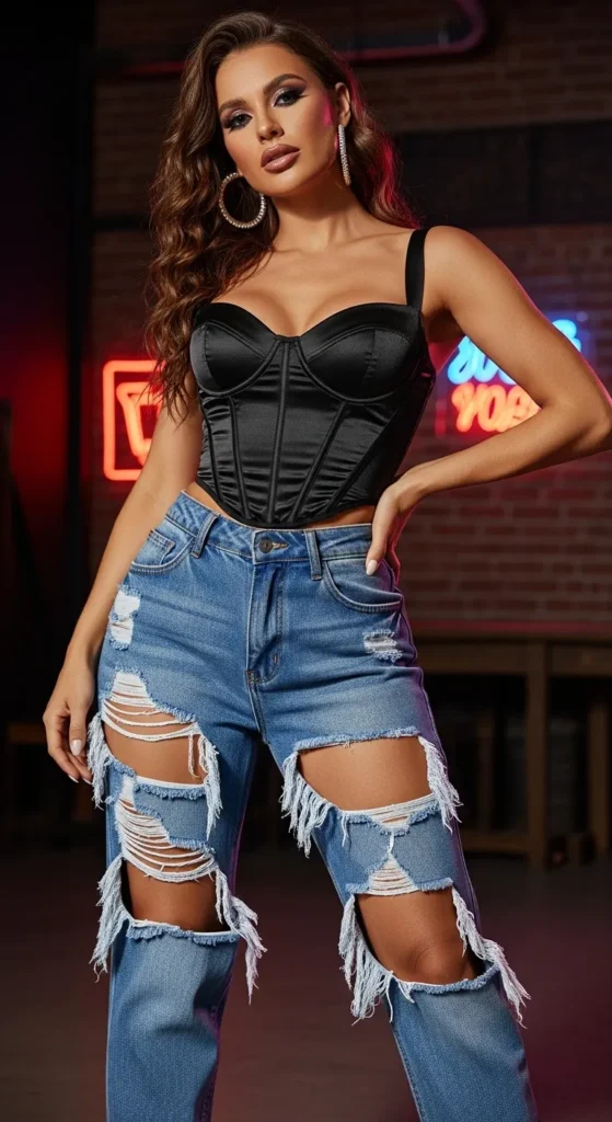 For evenings or casual nights out, ripped jeans paired with a corset top strike the perfect edgy-yet-feminine balance. It’s ideal when you want a mix of casual comfort and trendy style.