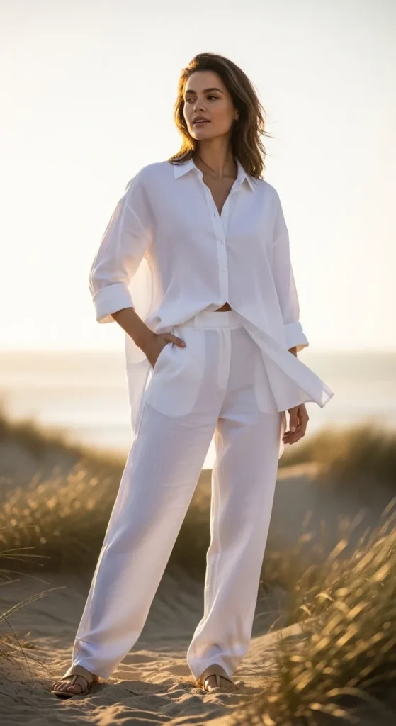 On a hot, busy morning when you want to look polished without trying too hard, a white linen set becomes your easiest win. The breathable fabric keeps you cool, while the clean look instantly makes you feel put together for errands or casual meetings. It’s the kind of outfit that saves time when you’re unsure what matches.