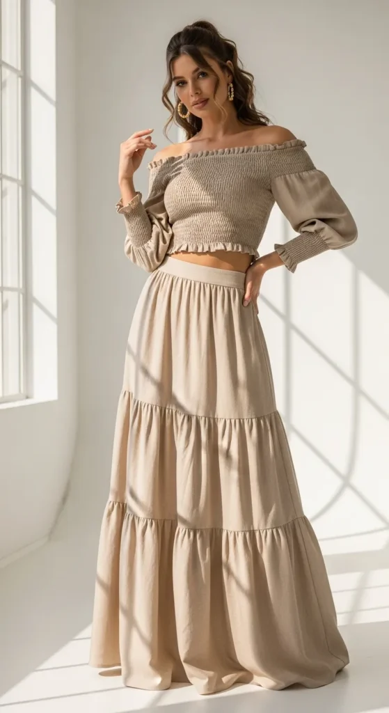 22. Beige Off-Shoulder Set & Tiered Maxi Skirt
