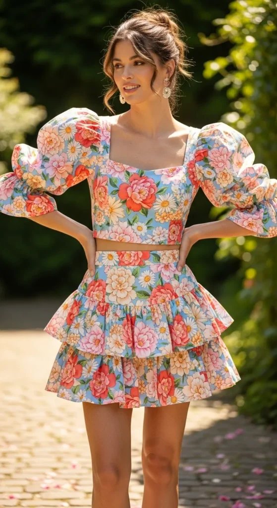 Coordinating sets can feel intimidating if the proportions are off. A floral puff sleeve top with a mini tiered skirt combines playful volume with feminine charm. It’s perfect for those who want a cohesive, bold look without sacrificing comfort. The tiered skirt adds movement, making every step feel effortless.