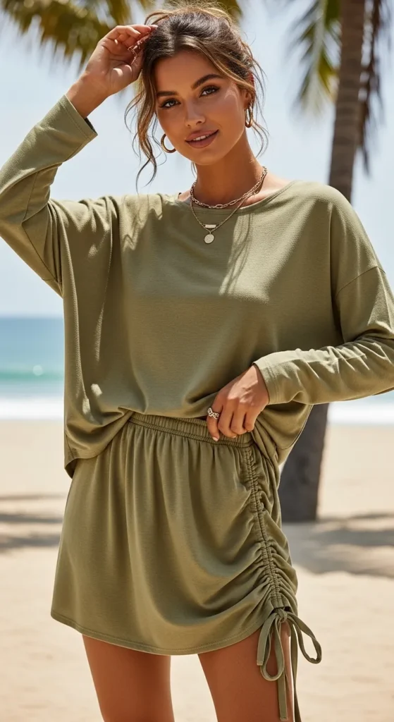 Matching sets are often tricky to pull off without feeling stiff. A light olive green set with a drawstring skirt solves that by combining ease with coordinated style. The drawstring waist allows flexibility, while the soft green tone keeps the look approachable and chic. It’s a go-to for casual summer days or weekend outings.