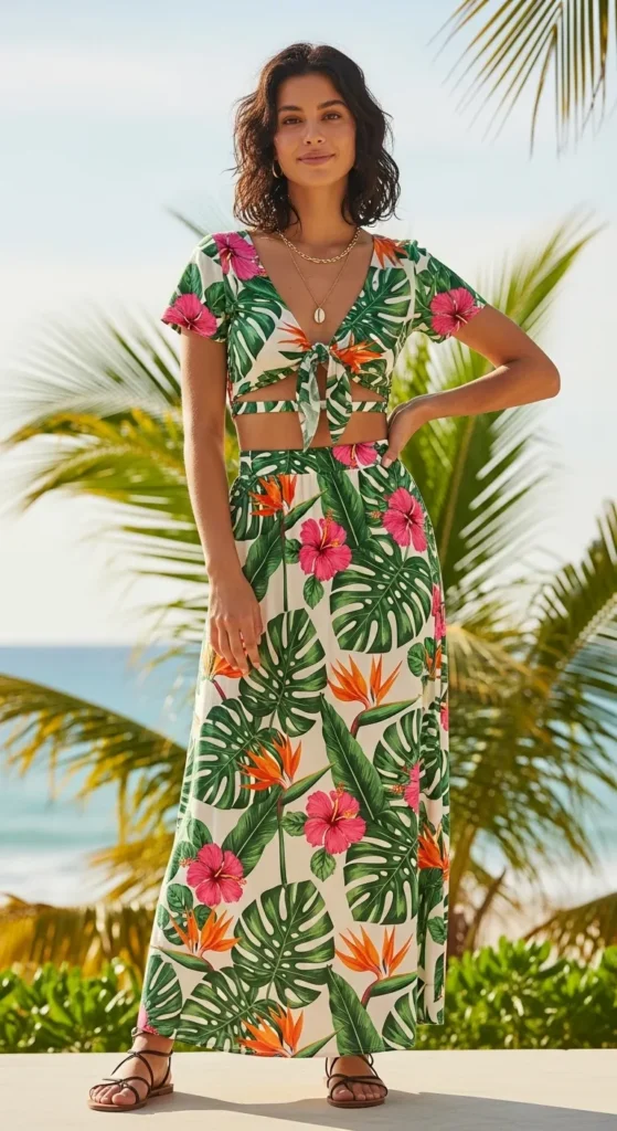 Styling separates in summer can feel exhausting, especially when time is limited. A matching crop top and tropical maxi skirt removes the guesswork while still looking stylish. The coordinated print creates a pulled-together outfit with minimal effort. It’s a go-to choice when you want to look confident, comfortable, and summer-ready in seconds.