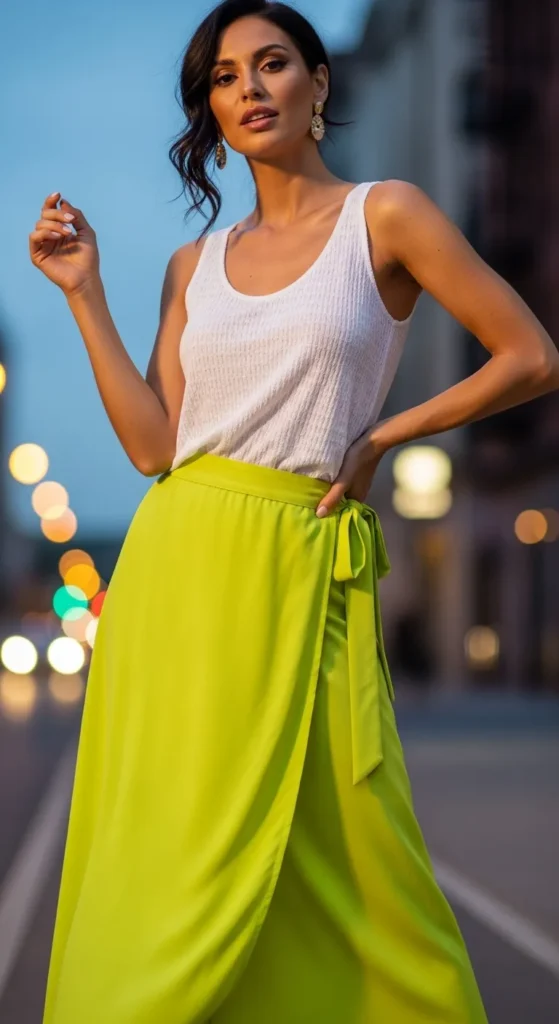 Bright colors can sometimes feel overwhelming, but pairing a neon yellow wrap skirt with a textured white tank balances boldness with simplicity. The wrap skirt allows easy movement and a relaxed fit, while the white tank keeps the look fresh and wearable. It’s perfect for days when you want to stand out without overdoing it.