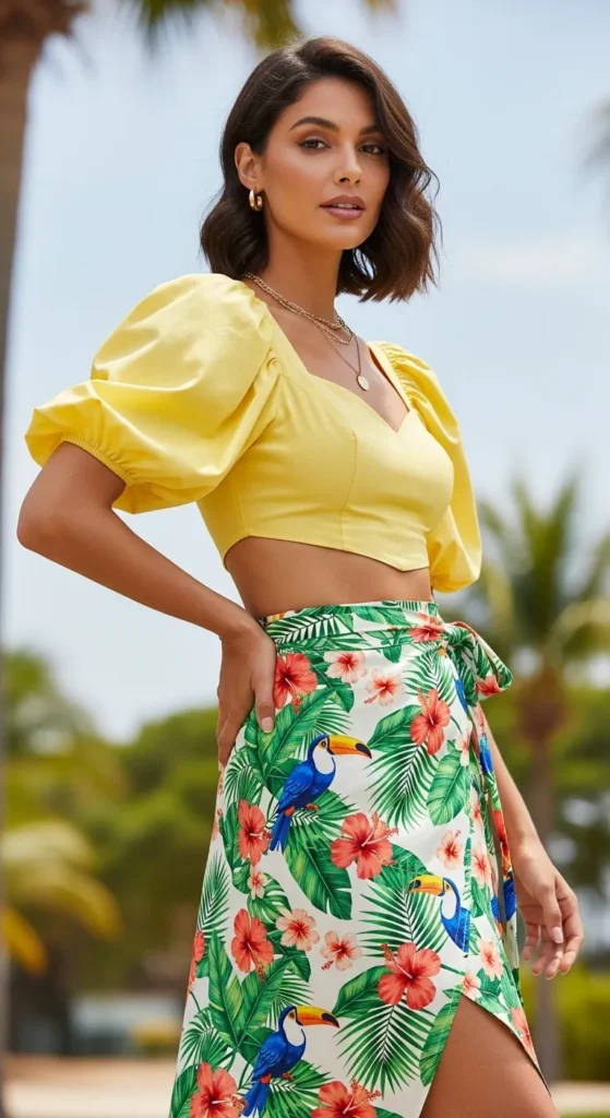 Printed skirts can be hard to style without overwhelming the outfit. A puff sleeve crop top softens the bold tropical wrap skirt and brings balance to the look. This outfit is perfect for vacations or sunny days when you want color without chaos. The wrap skirt adjusts easily, offering both comfort and style.