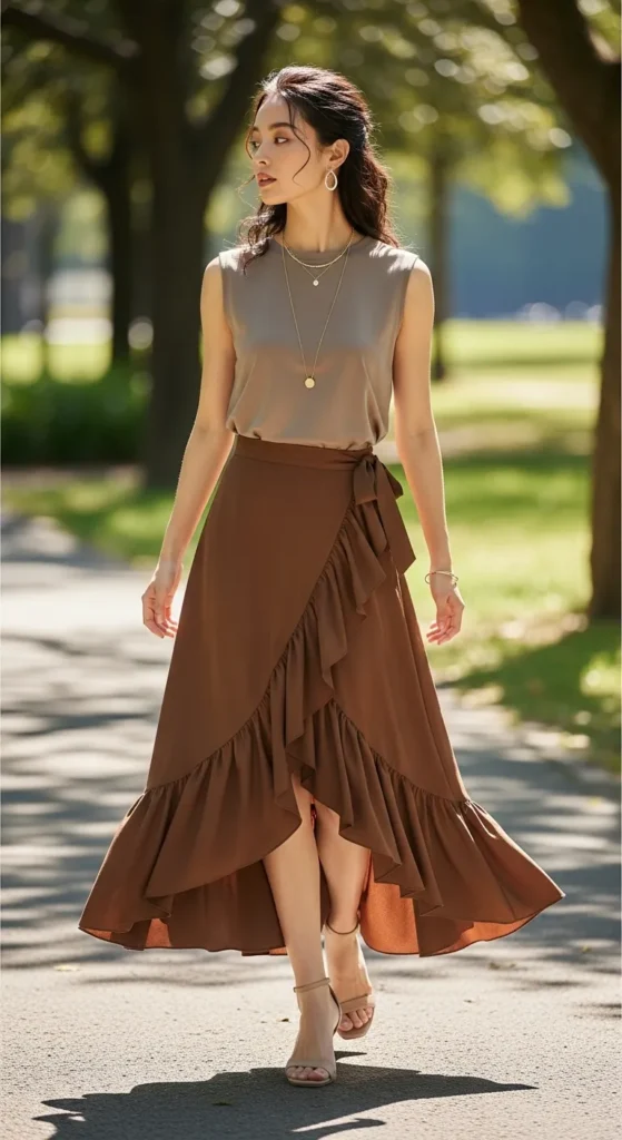 Neutral outfits can sometimes feel flat, especially in summer when you want warmth and depth. This taupe sleeveless top paired with a ruffled brown wrap skirt adds texture and movement without feeling heavy. It’s an easy solution for days when you want an elegant but low-effort summer look. The wrap design allows comfort and adjustability, making it perfect for long summer wear.