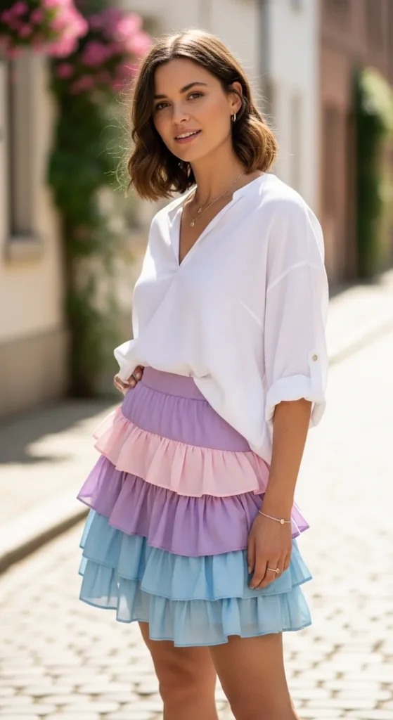 Sometimes skirts look cute but feel uncomfortable after a few hours. A tiered ruffle mini paired with a relaxed white blouse keeps the outfit airy and easy to move in. This summer skirt outfit is great for those who want a feminine style without tight fits or fuss. It flows naturally, making it perfect for relaxed summer outings and everyday wear.