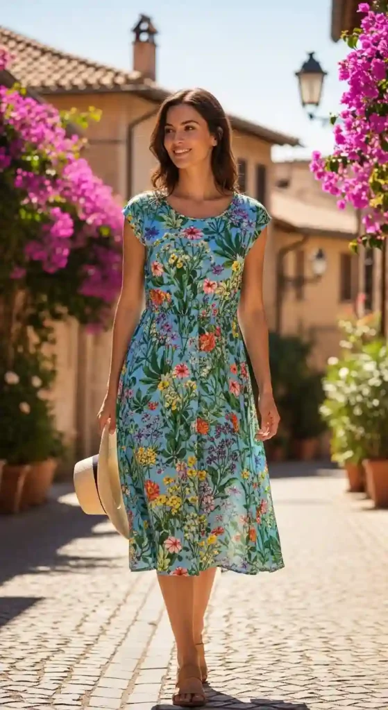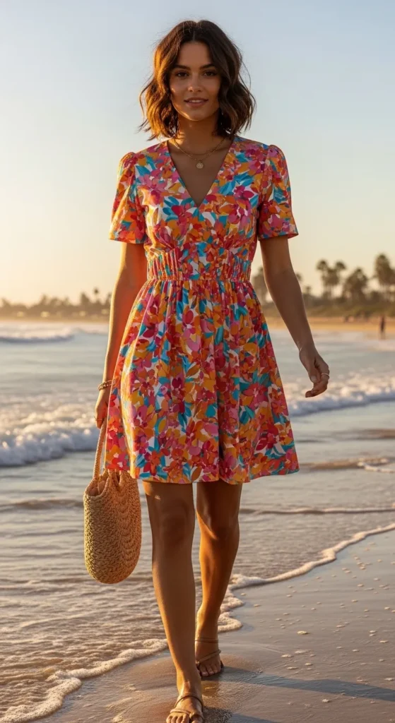 Sometimes summer dresses feel too plain, but this style solves that with its lively pattern and flattering sleeves. Pair it with wedges or sandals for a complete sun-ready look.